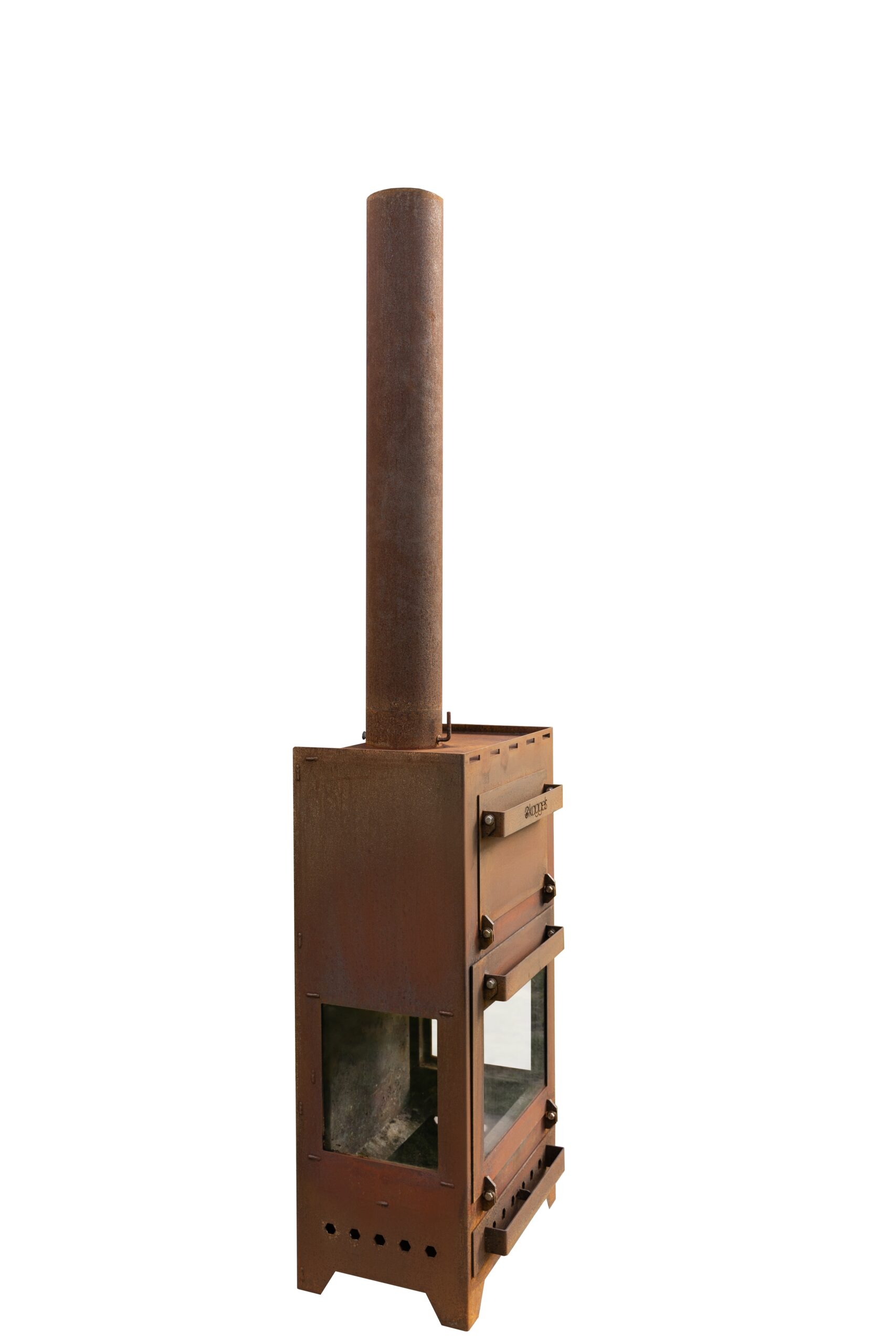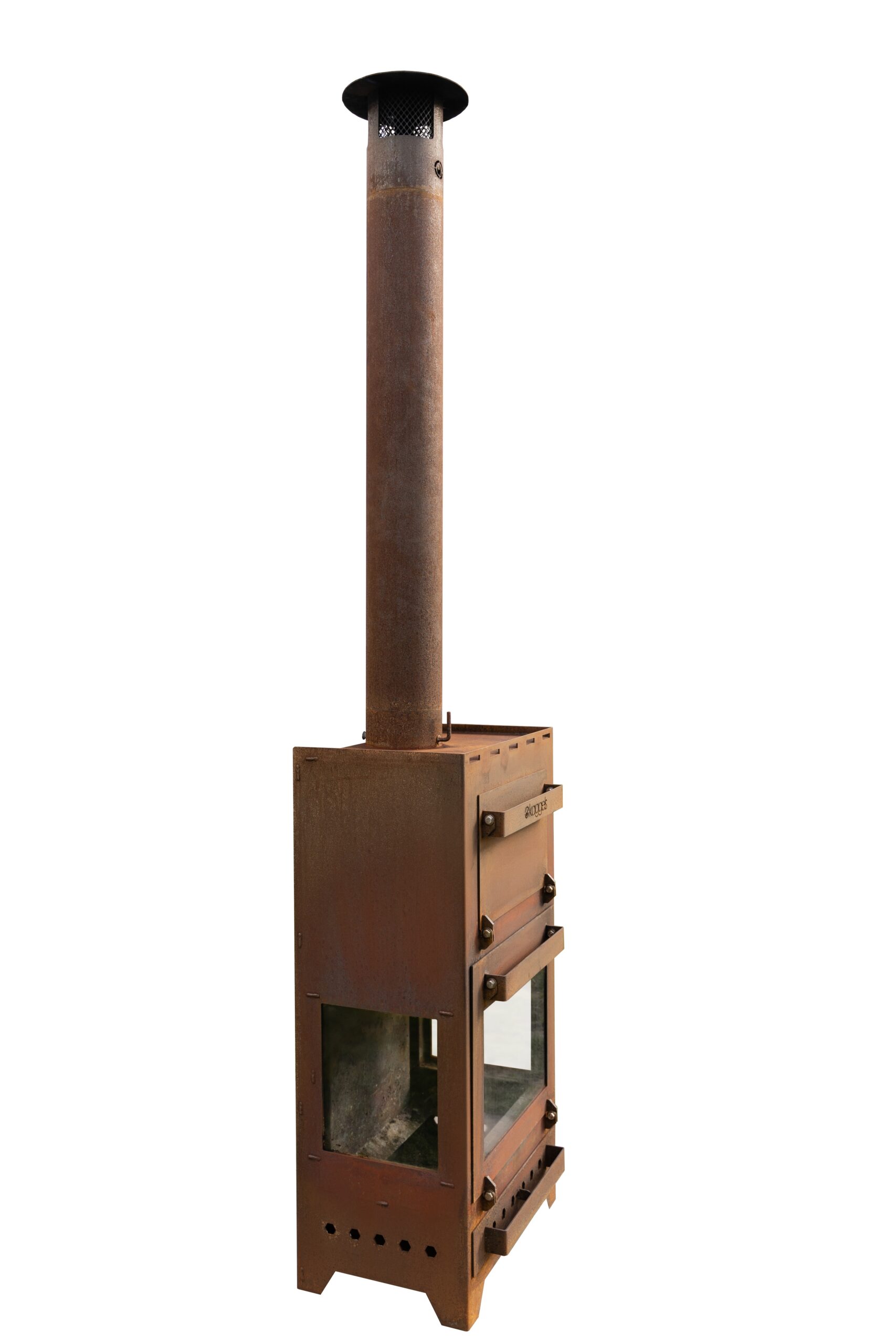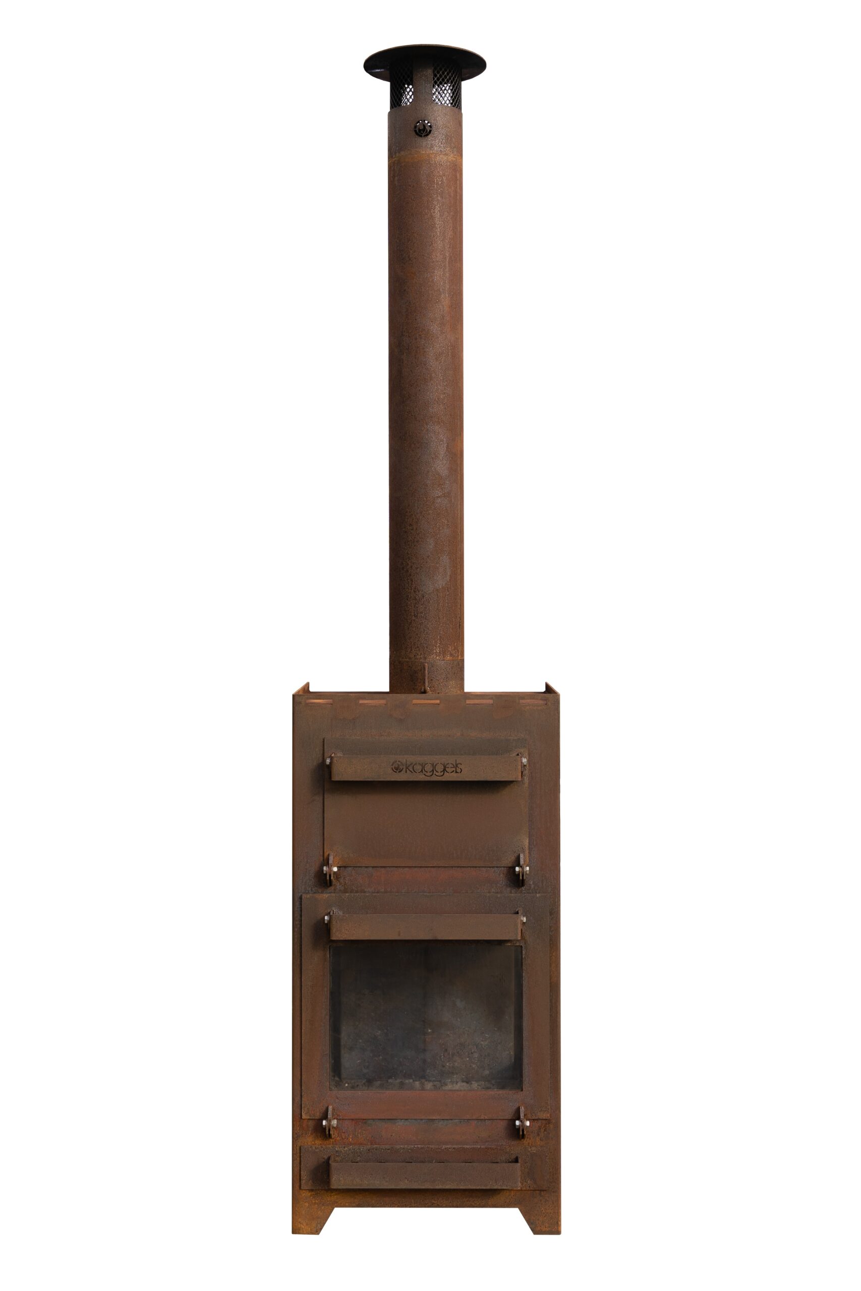 De Kaggel is vervaardigd van 3mm dik Cortenstaal. Ook bekend als weervast staal of onder de merknaam COR-TEN staal. Het is een metaal legering, bestaande uit ijzer waaraan koper, fosfor, silicium, nikkel en chroom zijn toegevoegd. De sterkte is vergelijkbaar met die van andere gelegeerde staalsoorten zoals roestvast staal. De roestkleurige en zeer dichte oxidehuid schermt het dieper liggende materiaal af van zuurstof, waardoor de oxidatie sterk vertraagt. Het voordeel van deze eigenschappen is dat de kaggel in weer en wind buiten kan blijven staan. Een echte buitenkachel dus! Het oxidatie proces duurt tussen de 6 en 8 weken, waarna de kaggel een egaal roestbruin uiterlijk krijgt.